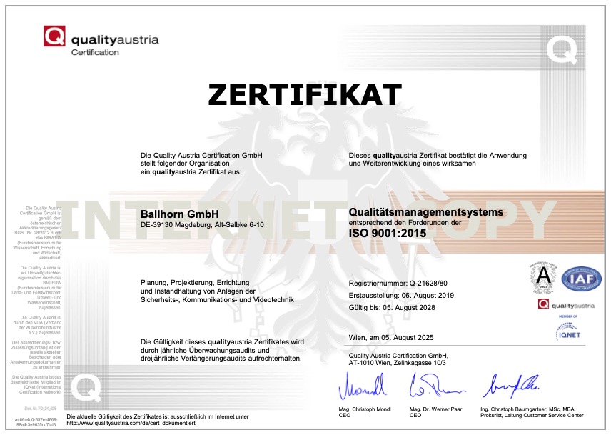 Unsere Zertifizierungen sind wichtige Parameter für hochwertigste Qualität in allen Bereichen unseres Wirkens. Nachfolgend unsere wichtigsten Zertifizierungen: